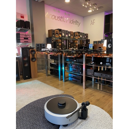 Giradischi compreso di braccio, trazione a cinghia, con regolazione elettronica della velocità 33 e 45 giri (78giri manuale). Piatto in MDF. Base in MDF disaccoppiata su 3 coni in alluminio. Fornito di serie con braccio in carbonio Pro-Ject 9c, connettori RCA posteriori placcate oro, per l'intercambiabilità del cavo phono. Peso 8 Kg.